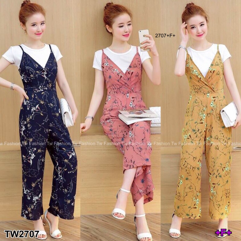 เซต 2 ชิ้นเสื้อยืดสีขาว+เอี้ยมกางเกงสายเดี่ยว ลายดอก TW2707